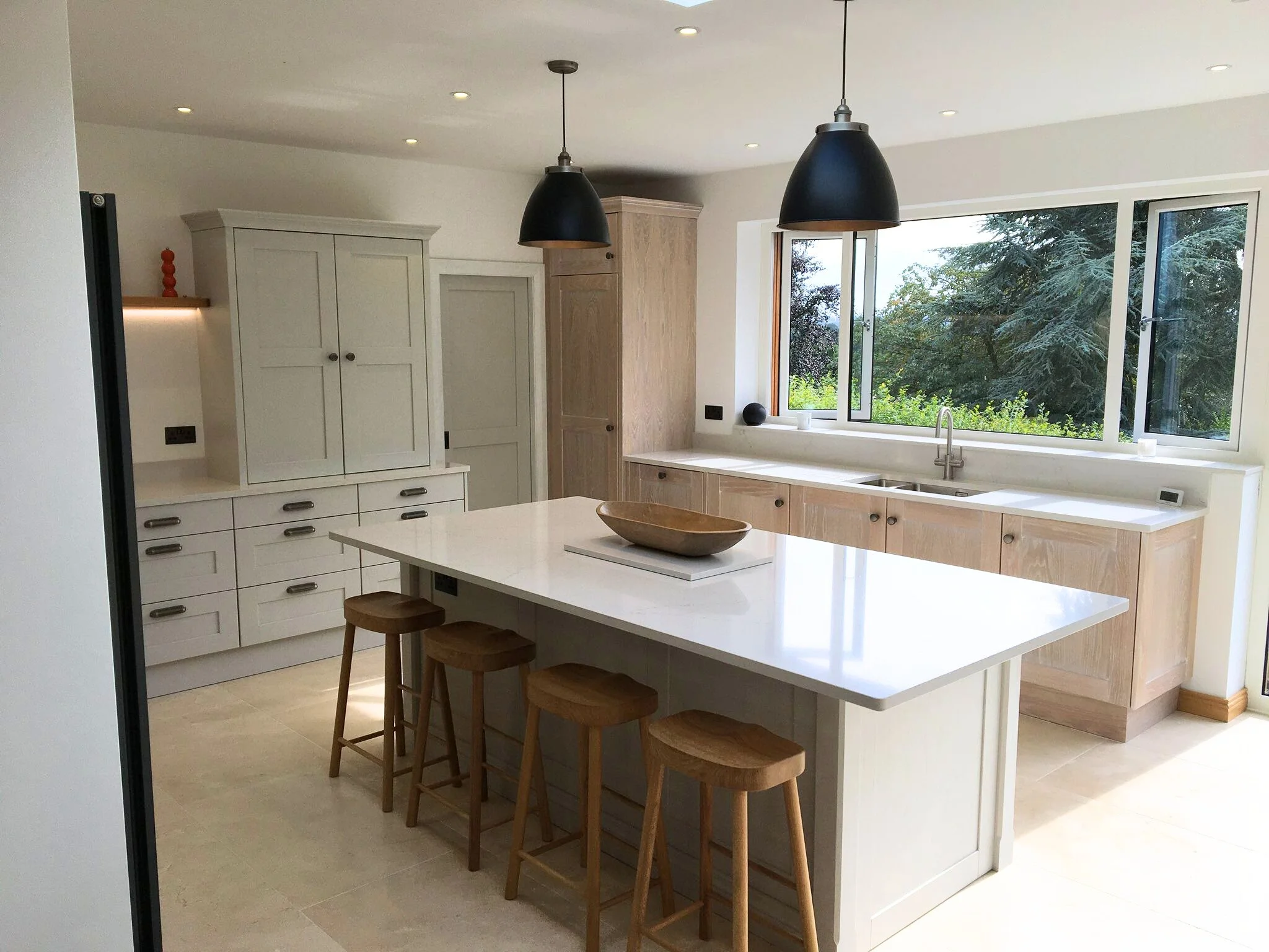 The client chose French Grey for the cabinets, Treron Green for the island unit, and Quartz worktops with a Belfast sink.