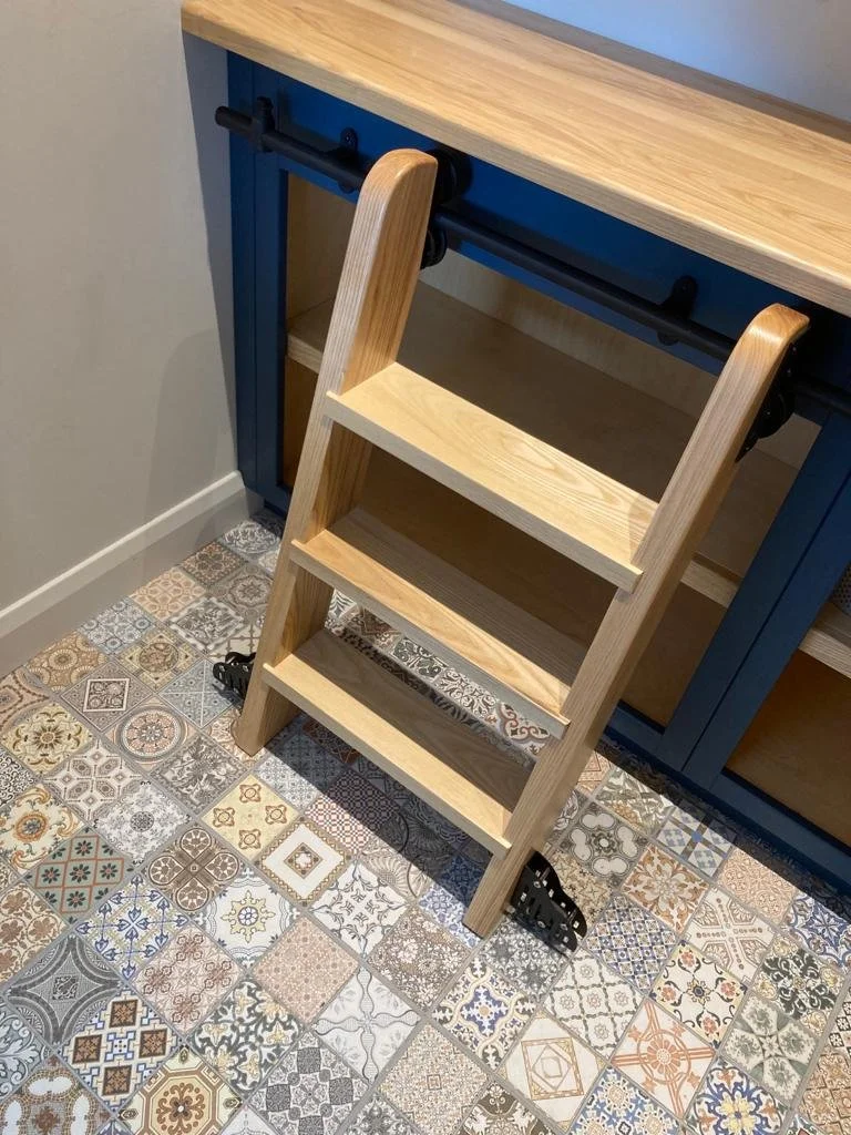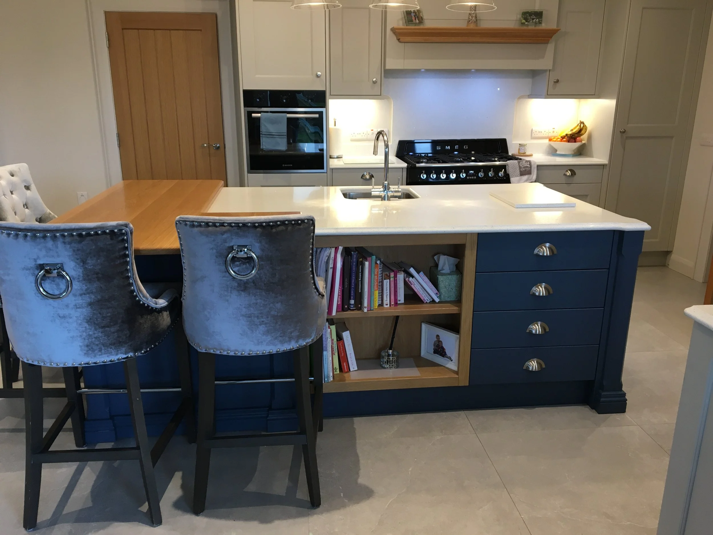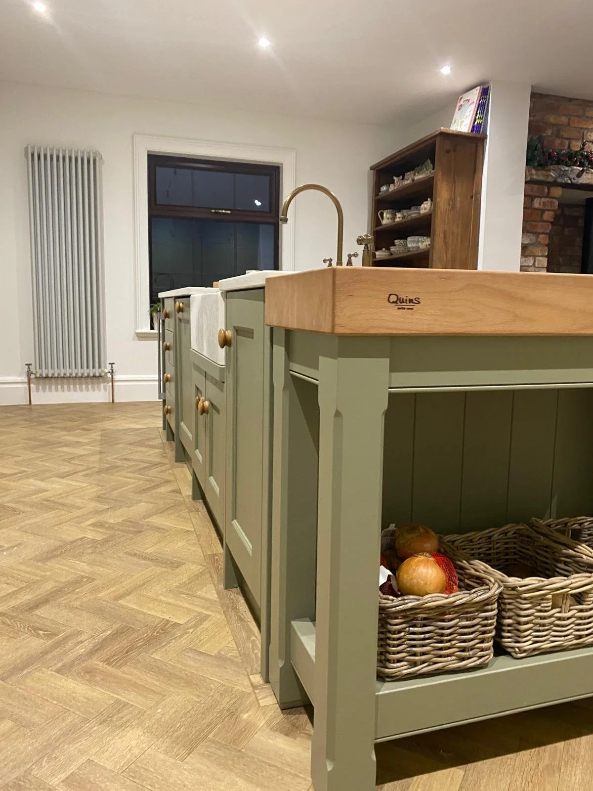 Kitchen featuring large island, bespoke mantle unit with side storage, beech butcher’s block and hidden utility room. Client chose French Grey for cabinets, Treron Green for island unit and Quartz work tops with a Belfast sink.