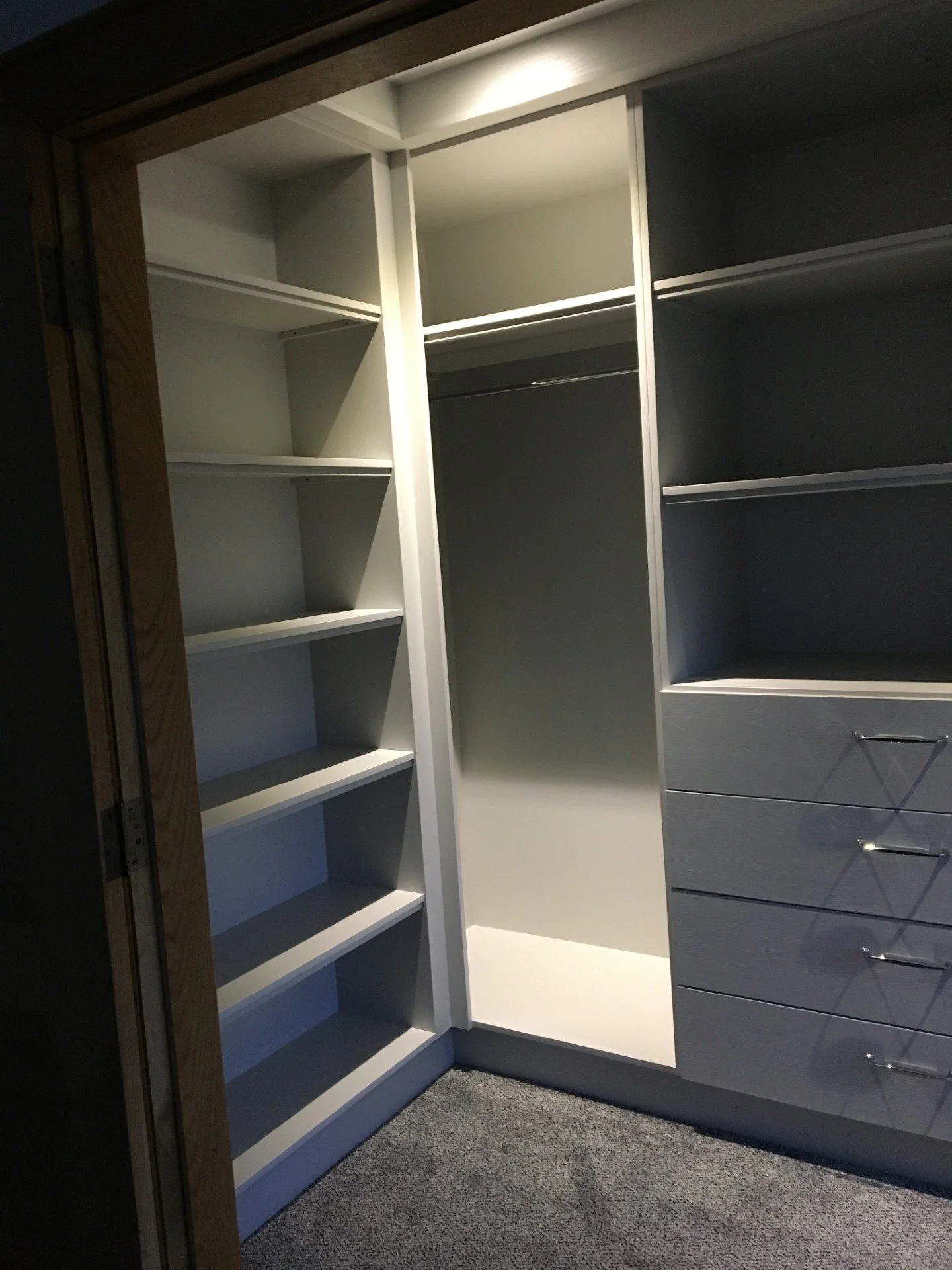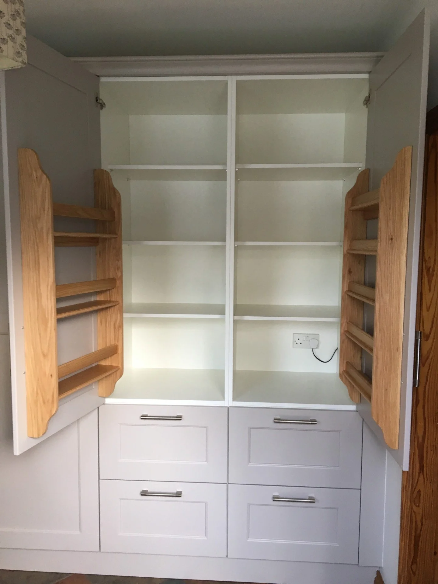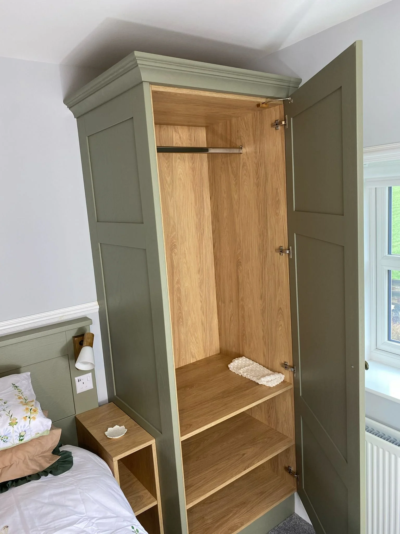 Built-in bedroom furniture finished in Treron Green Fireplace Surrounds Hall Storage unit Skandi-style Bookcase Unit to host bathroom sink Garden table & bench Built in bedroom wardrobes Custom bedroom Storage